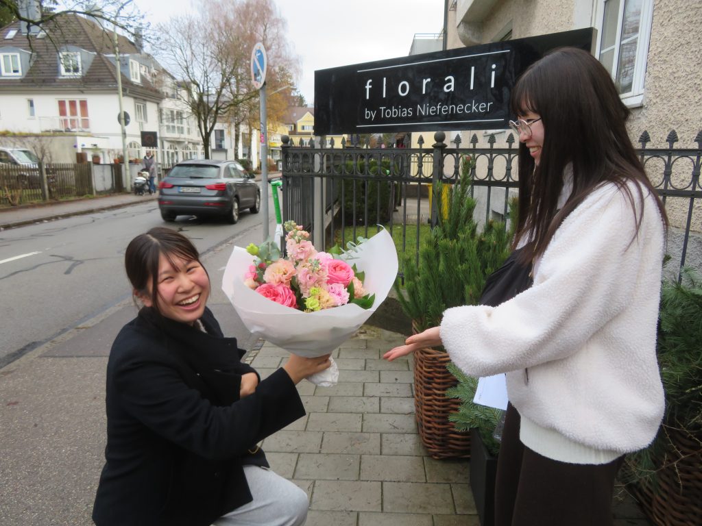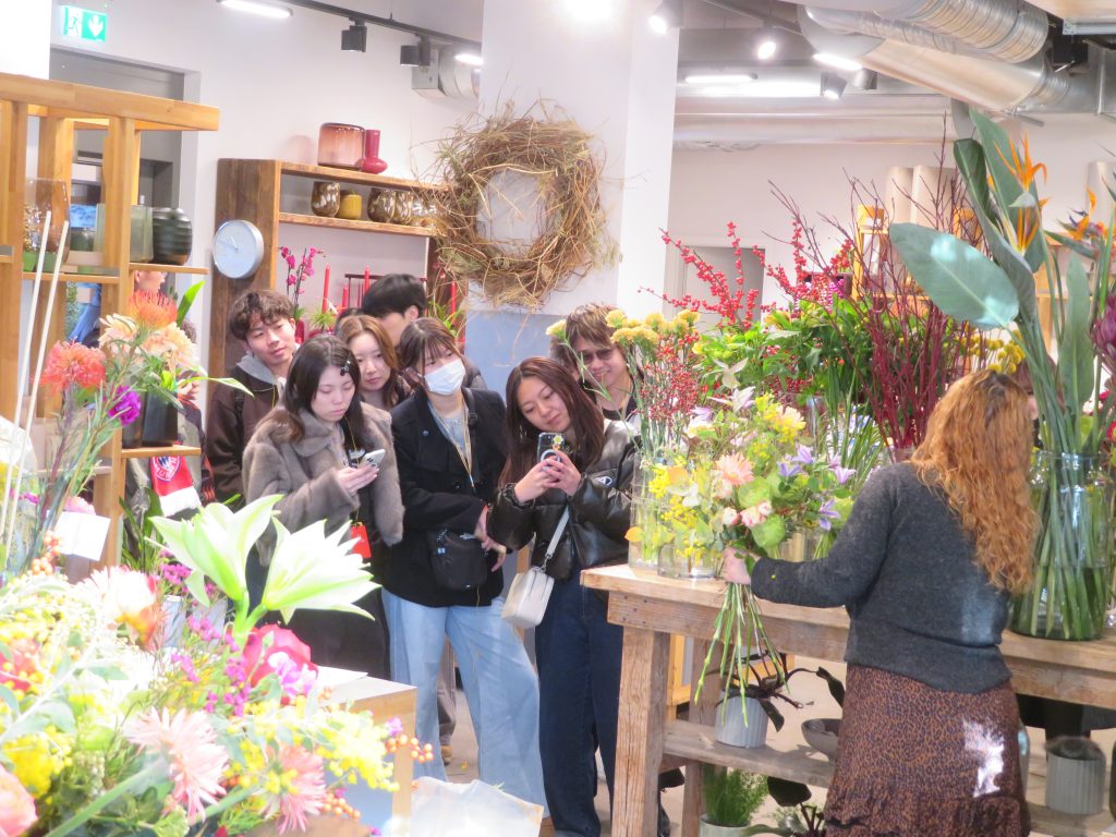 その後、かつて本校の卒業生が勤務していた花店「Florali by Tobiasa Niefencker」を訪問。実際に花束を購入し、ドイツのフローリストがどのように花を扱い、組み上げていくのか、その鮮やかな手さばきを間近で見学させていただきました。