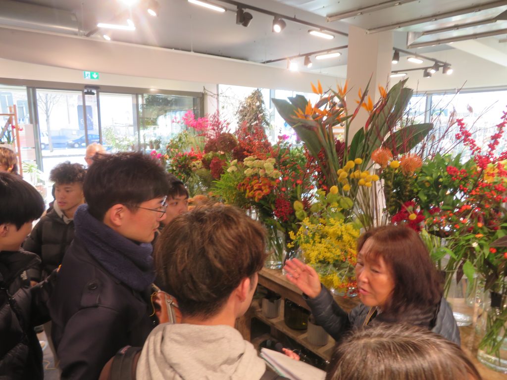 店内には数十万円もするオブジェが並び、切り花も一級品ばかり。最高峰のフローリスト技術とビジネスの現場に、学生たちも圧倒されつつ、その美しさに釘付けとなりました。