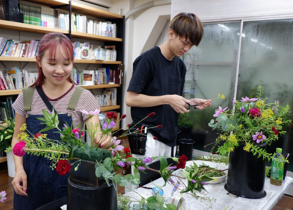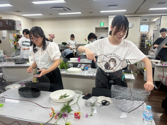 さてJFTD学園では、2学期からフラワーデザインの授業も応用編に入っています。秋は枝物や実物が豊富な季節。表情豊かな季節の花材を使い、1学期学んだ基礎の復習をしながら表現力をさらに養い、バランス感覚を磨きます。